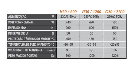 Apresentamos três modelos, comercializados por nós, de motores para portões de correr: o H30 de 600 Kg, o R30 de 1200 Kg e o G30 de 2200 Kg. Toda a estrutura exterior deste equipamento é formada em alumínio, exceto as coberturas. Todos eles têm 4 pontos de fixação ao chão, afim de prevenir oscilações com o percorrer do tempo.