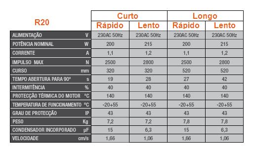 Os equipamentos da série R20 são motores electromecânicos ( vulgarmente conhecidos como " fuso" ) e destinam-se à automatização de portões de duas folhas de batente. Encontrando-se disponíveis em três tamanhos, os curtos com 320mm de curso os longos com 520mm e os extra longos com um curso de 1000mm. Todos eles podem ou não ser comercializados em kit.