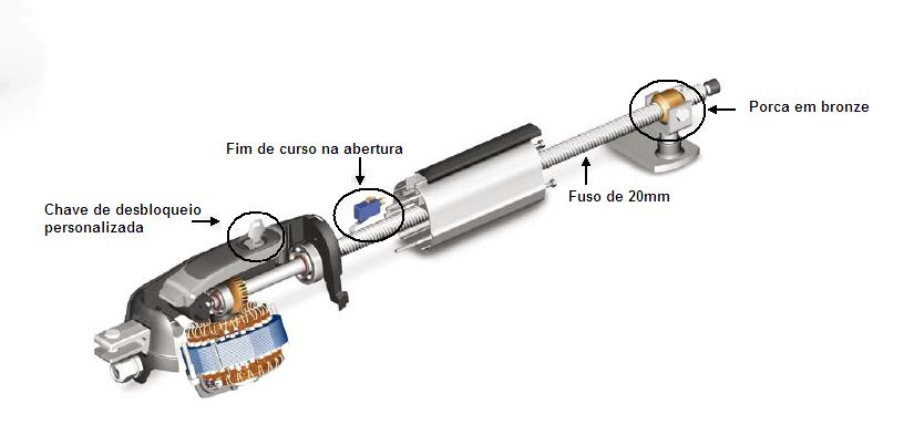 - Chave de desbloqueio personalizada, que permite a abertura manual em caso de falta de energia eléctrica. - Os comandos podem executar outras funções, como abertura de porta de homem ou ligar luzes. - Todos os motores vêm de série equipados com fim de curso eléctrico na abertura. - O quadro de comando permite aos motores fazerem abrandamento. - Um fuso de 20 mm, e uma porca em bronze fazem a tranmissão do movimento para o portão. |